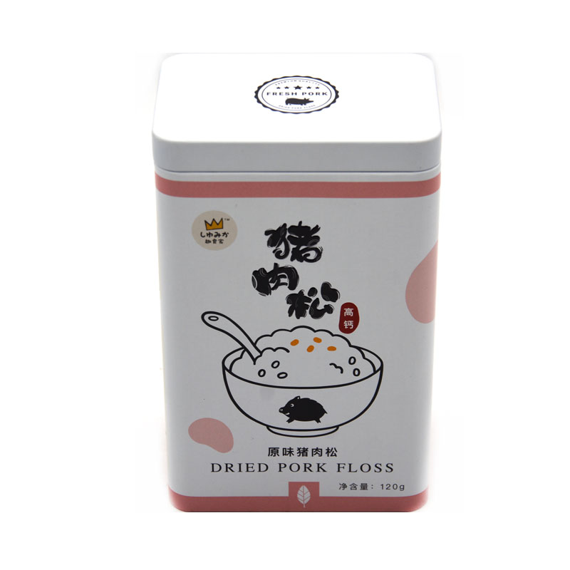 該款120g豬肉松食品鐵盒采用厚度0.23mm一級鍍錫馬口鐵制作,是三片式,天地蓋拍底結構。包裝盒的裝飾圖案進行3D雕刻處理;以白色為主色調,配合圖案體現了簡約大氣的形象。豬肉松食品鐵盒蓋子是內卷線。其采用的印刷工藝是專色色印刷,蓋子LOGO采用3D雕刻工藝。其尺寸是100*70*160mm(尺寸可以更改)。這種拍底結構的鐵盒適合保健品、食品等包裝,你可根據自身需求,選擇不同厚度的馬口鐵/磨砂鐵制作。