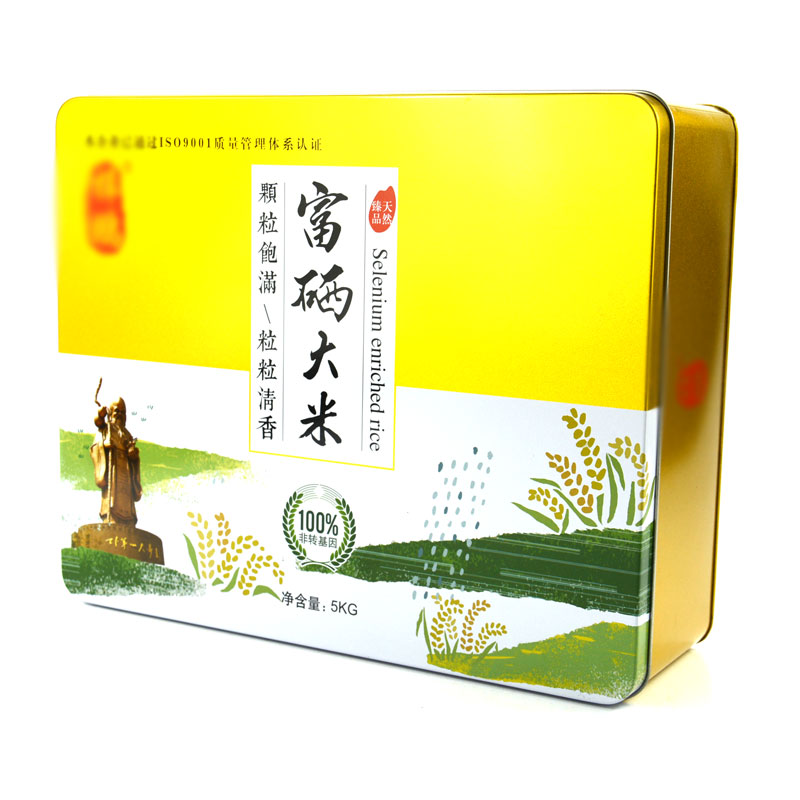 這款品牌大米包裝鐵盒采用國產馬口鐵制作;結構是三片式天地蓋,蓋內卷。蓋子表面品牌文字名稱進行3D雕刻。