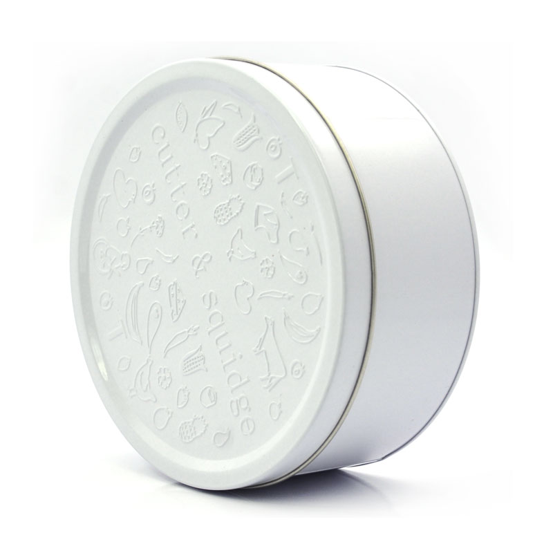 這款乳白色圓形餅干鐵盒采用國產食品級馬口鐵制作;是三片式天地蓋,蓋外卷結構。蓋子上的小圖標進行3D雕刻處理,印刷色調以乳白色為先;;這個創意的設計是月餅主要的買點,讓人客戶餅干盒設計比較簡約。
