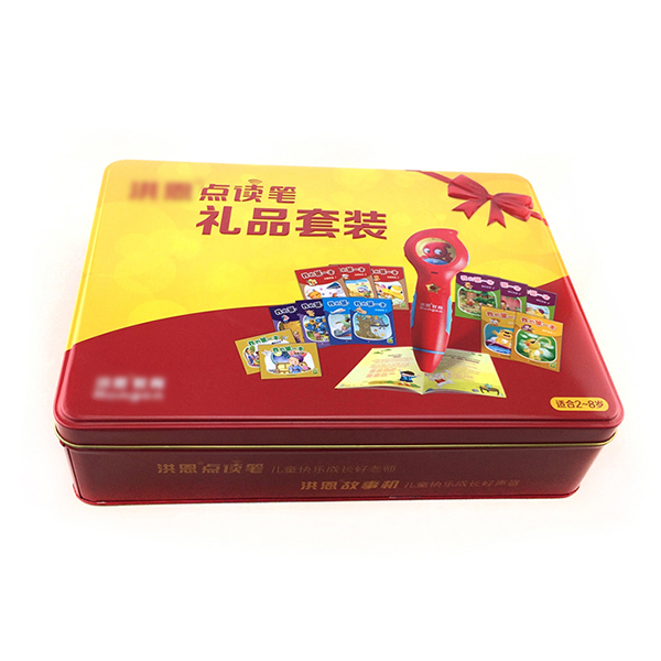 點讀筆文具鐵盒表面進行單面CMYK四色+專色工藝印刷,盒子內外兩面均涂罩一層亮光油,提升點讀筆文具鐵盒外觀效果同時,還提升鐵盒表面硬度,起到一種防護的作用。為外表面油料根據不同效果可分為:啞油、珍珠油、皺紋油、珠光油,過油選擇需根據客戶的需求而執行制作,一般是在打樣過程中所確定的。